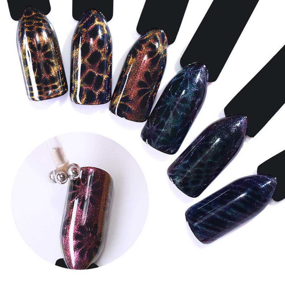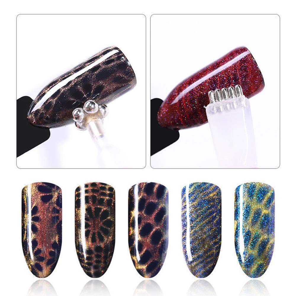 Двусторонний фигурный магнит для гель лаков коллекций с эффектом «Кошачий Глаз», с помощью которого можно создать множество разнообразных узоров. В зависимости от угла наклона, под которым вы держите ту или иную сторону магнита, будет зависеть и сам рисунок, создаваемый магнитом, и его четкость.
